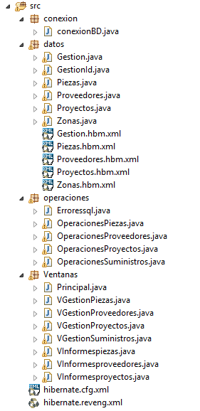 Menú Gestión de Tablas: desde este menú podremos hacer el mantenimiento de las tablas Proyectos, Piezas y Proveedores. Al hacer clic en los elementos de menú se abrirán los JPanel correspondiente para las operaciones sobre las tablas.